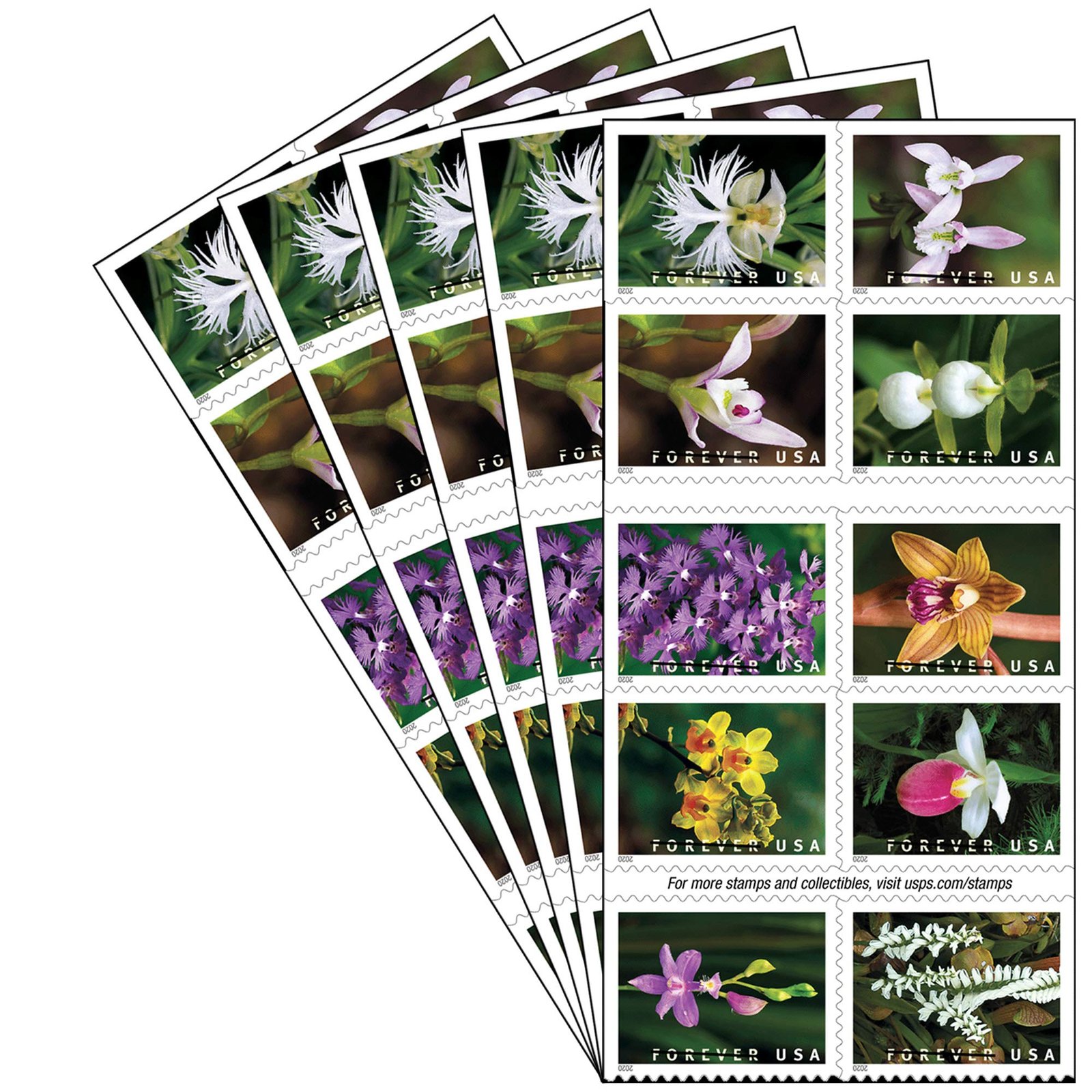 The 2020 Wild Orchids Forever® Stamps feature ten exquisite illustrations of orchids that grow wild in the United States. These are the premier choice for those seeking Forever stamp sets for floral wedding invitations, gala announcements, and high-end personal stationery. The intricate details and vibrant colors provide a sophisticated and exotic aesthetic for your mail.